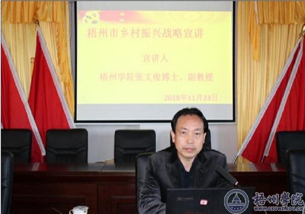 11月23日,马克思主义学院教师张文俊博士、副教授受梧州市委宣传部委派,前往藤县太平镇和古龙镇进行了乡村振兴战略专场宣讲活动,共有110多名干部群众聆听了宣讲。