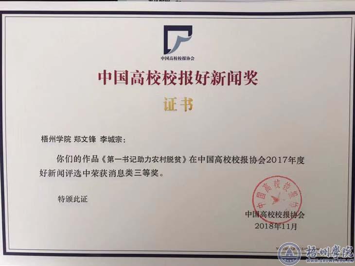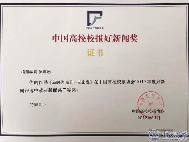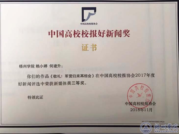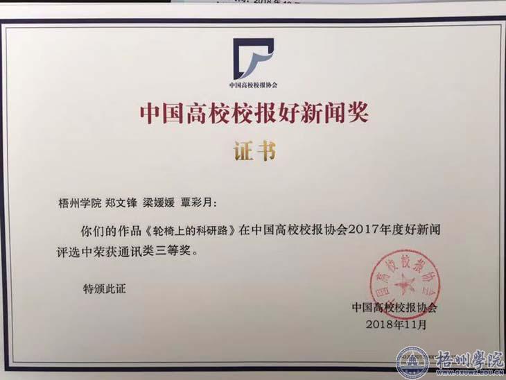 由吴嘉恩排版的校报版面《新时代 我们一起出发》获版面类二等奖;由郑文锋、李城宗采写的报道《第一书记助力农村脱贫》获消息类三等奖;由郑文锋、梁媛媛、覃彩月采写的报道《轮椅上的科研路》获通讯类三等奖;由赖小婷、何建升采写的微信推文《敬礼!军营归来再相会》获新媒体类三等奖。