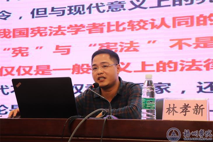 林孝新从坚持中国共产党的领导是人民的历史选择、依宪治国是历史的必然和现实的选择、坚持党的领导与依宪治国双促互强三个方面对坚持党的领导与依宪治国的辩证关系进行了讲解。他在宣讲中指出,社会主义法治必须坚持党的领导,党的领导必须依靠社会主义法治,党和法、党的领导和依法治国是高度统一的。他表示,希望大家做尊法的模范,带头尊崇、敬畏宪法法律;做学法的模范,带头了解、掌握宪法法律;做守法的模范,带头遵守宪法,捍卫法治;做用法的模范,带头运用宪法、依法办事。