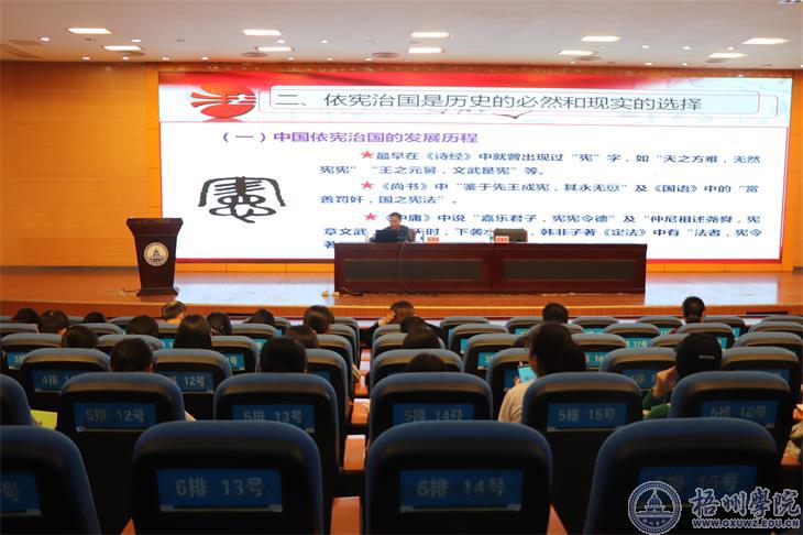12月4日下午,我校在明理楼一楼学术报告厅举行“国家宪法日”宪法宣讲会。梧州市政法委下属法学会专职副会长林孝新以“深刻把握坚持党的领导与依宪治国的辩证关系”为题进行宣讲。教师代表、学生代表共400多人参加宣讲会。梧州学院党委常委、普法办公室主任陈健萍主持宣讲会。