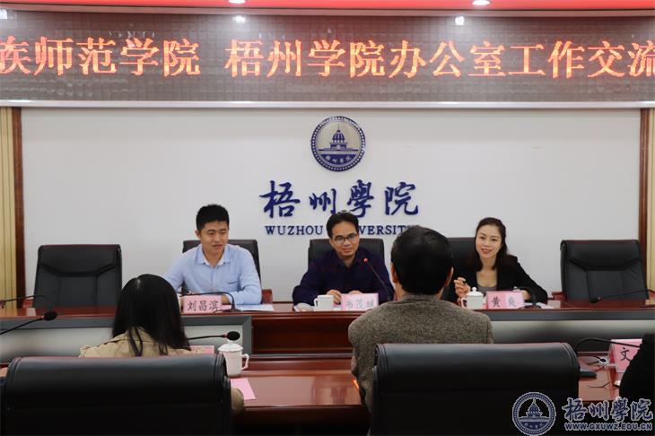 12月5日上午,广西民族师范学院党委常委、办公室(院长办公室)主任韦茂斌一行3人到我校交流考察,在明理楼八楼第一会议室召开工作交流座谈会。我校校长助理,党委(院长)办公室、校友工作办公室主任李远林,党委(院长)办公室副主任文玉兰,以及相关科室负责同志参加了座谈会。