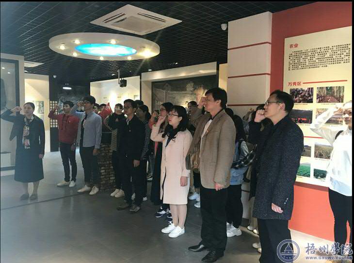 中共广西第一个农村党支部是广西红色革命的发源地之一,馆内展出图片近100张,文物数十件,油画、铜像、视频等,生动地诉说着当年革命史。党员们在展厅里认真浏览墙上的一幅幅红色印记,了解在烽火岁月里梧州党支部的革命历程。通过参观学习,缅怀老一辈共产党人的丰功伟绩,激励党员们要继承发扬我党和老一辈革命家的优良传统,要以实际行动践行“两学一做”,坚定理想信念,更好的发挥党员先锋模范作用。活动中,全体党员同志在党旗下庄严地举起右手,重温了入党誓词。