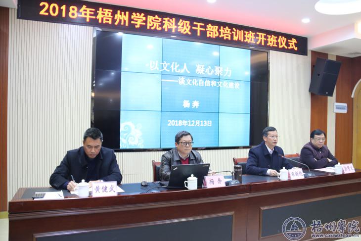 开班仪式结束后,杨奔校长作了首讲报告。他以《以文化人 凝心聚力——谈文化自信和文化建设》为题,作了专题报告。他从解读习近平新时代中国特色社会主义思想的内涵和要义出发,阐述了党的十九大报告关于文化自信的要求,结合梧州地域文化元素和学校校园文化建设,进而对全体学员提出“弘扬传统文化,提升自身修养”的期望。