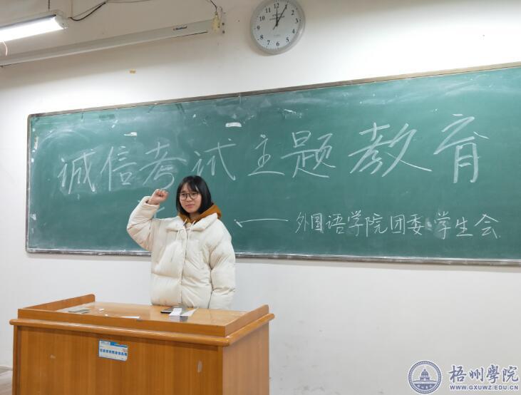 活动内容包括学习《梧州学院学生考试违纪和作弊的认定及处理办法(修订)》和进行承诺宣誓。此次诚信考试主题教育活动的成功举办,让学生对于诚信考试有了更清晰的认识,也更明确了努力学习、诚信考试的坚定想法。