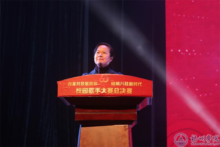 曹迎副书记在致辞中表示,校园有了文化就有了文明底蕴,校园有了艺术就拥有了精神升华,校园歌手大赛作为我校最具特色的文化品牌活动之一,丰富了同学们的课余文化生活,活跃了校园文化氛围,也为同学们提供了一个展示自我,绽放个性的舞台。她鼓励同学们要勇敢的放飞梦想,用心灵感受艺术,用艺术点燃激情,用激情创造辉煌,演绎自己的特长,放飞自己的梦想,以饱满的热情,嘹亮的歌声,唱响“建设壮美广西,共圆复兴梦想”的新时代主旋律。