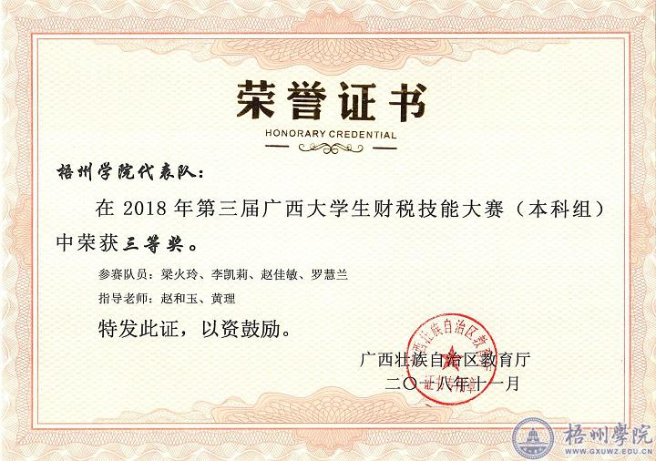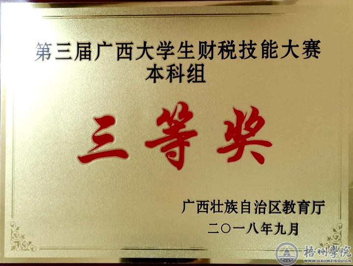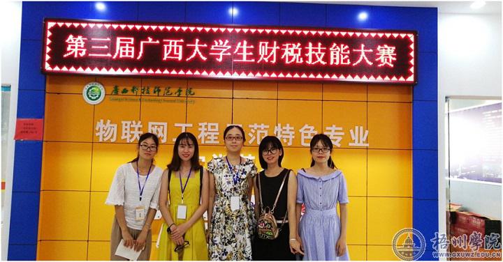 第三届广西大学生财税技能大赛是由广西教育厅主办的,于2018年9月15日在广西科技师范学院来宾校区举行。本次比赛共分初赛,决赛两个阶段。初赛由理论知识比赛和财税方案设计构成,成绩为两部分得分合计。我校四名选手在来自全区16所高校的64名选手中脱颖而出,以初赛第五名,团队299分的好成绩突围进入决赛。