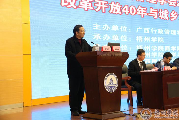 学校副校长麻新纯在致辞中代表学校对年会的召开表示祝贺,并对与会人员领导、嘉宾表示热烈的欢迎和感谢。他指出,梧州学院坚持以育人为根本,以教学为中心以人才为支撑以服务为发展的办学理念,逐步形成了紧贴业界、校地协同、东融西联、通江达海的办学特色,努力办成一所立足梧州服务珠江经济带,面向东南亚和“一带一路”特色鲜明的应用型高水平大学。他强调,用改革开放的宏大视野来研究城乡治理变迁对推动国家战略和服务地方经济社会发展具有重大现实意义。此次年会的召开提升了梧州学院的行政管理水平,加强了区内兄弟院校的工作交流,学校将把年会的成果转化为学校发展的动力。