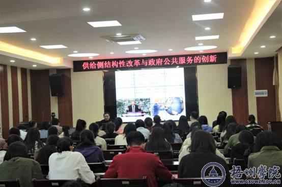 12月23日上午,广西民族大学副校长、博士生导师、广西行政管理学会会长李珍刚教授应法学与公共管理学院邀请,在我校明理楼七楼视频会议室为我校作了题为“供给侧结构性改革与政府公共服务的创新”的学术报告,报告会由法管学院方勇副院长主持,出席报告会的还有商学院杨西春院长、学校规划处朱良华副处长及法管学院、商学院的部分师生共100余人聆听了报告会。