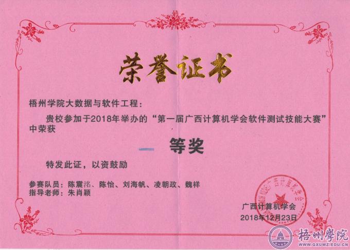 整个比赛由三个上机操作模块组成,赛程为期两日,首日是功能测试操作与分析实践和自动化测试实践比拼,次日为性能测试操作与分析实践。由我校大数据与软件工程学院2016级软件工程专业陈震洺、陈怡、刘海帆、魏祥、凌朝政5人组成的“你们说的全队”团队稳扎稳打,凭借充分的赛前准备和良好的分工与协作,在历经两天紧张而又激烈的比赛后,最终取得本届大赛的一等奖。本次大赛以“创新实训,以赛促学”为主题,旨在提高大学生实践技能,培养和挖掘更多优秀的软件测试人才。通过比赛不仅提高了学生的学习积极性、主动性、创新意识和创新思维,还有利于我校的产、学、研结合,促进我校软件人才的培养。