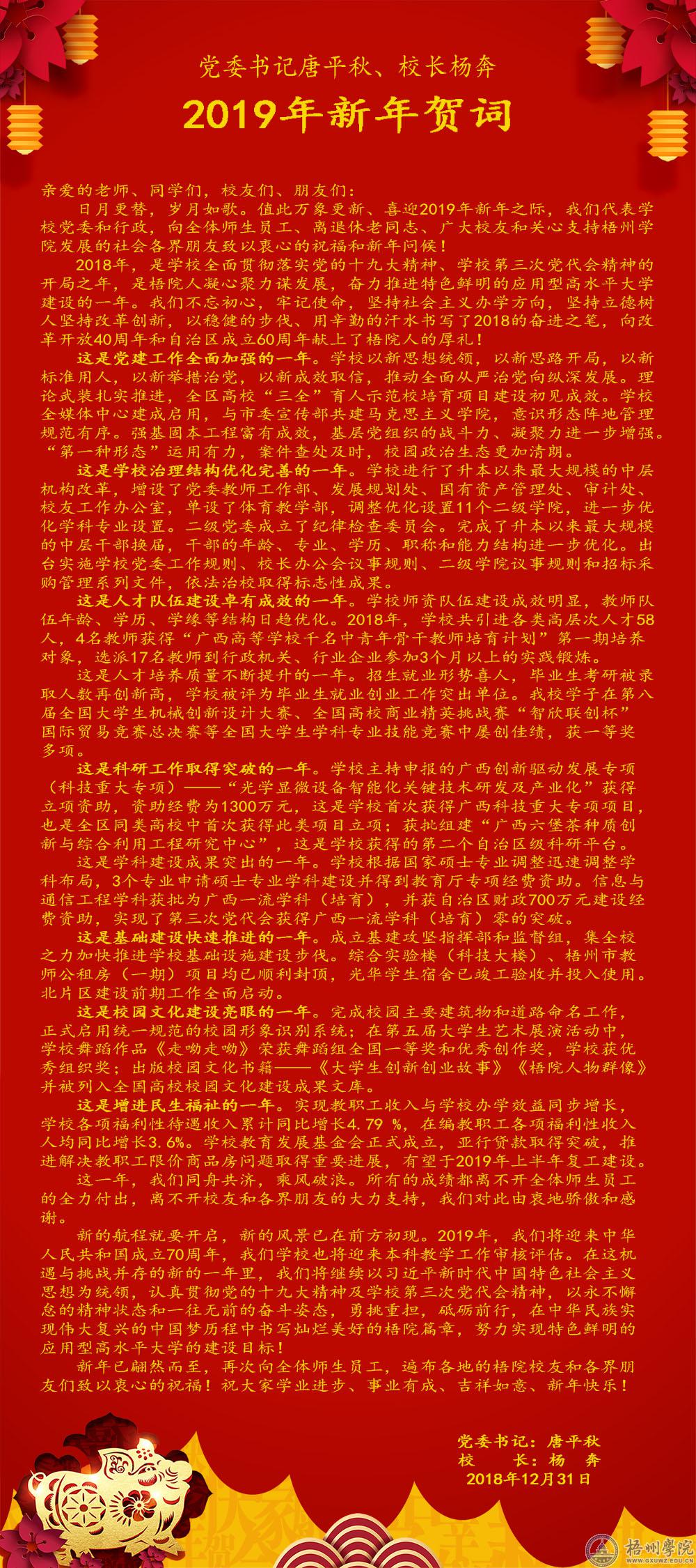 党委书记唐平秋、校长杨奔 2019年新年贺词