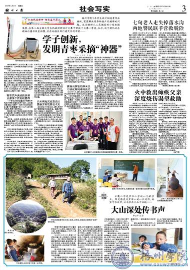 日前,由梧州学院2015级机械设计制造及其自动化专业梁功顺、陈金源,2016级机械设计制造及其自动化专业龚运成、刘奇波,2016级电子信息工程专业的郭辉双等5名学生设计制造的青枣采摘机,解决了青枣种植户采摘难的问题。这台辅助人工采摘类的小型机械装置,在第八届全国大学生机械创新设计大赛中,从全国30个省(自治区、直辖市)共703所高校的5276件切题作品中脱颖而出,荣获了大赛一等奖。