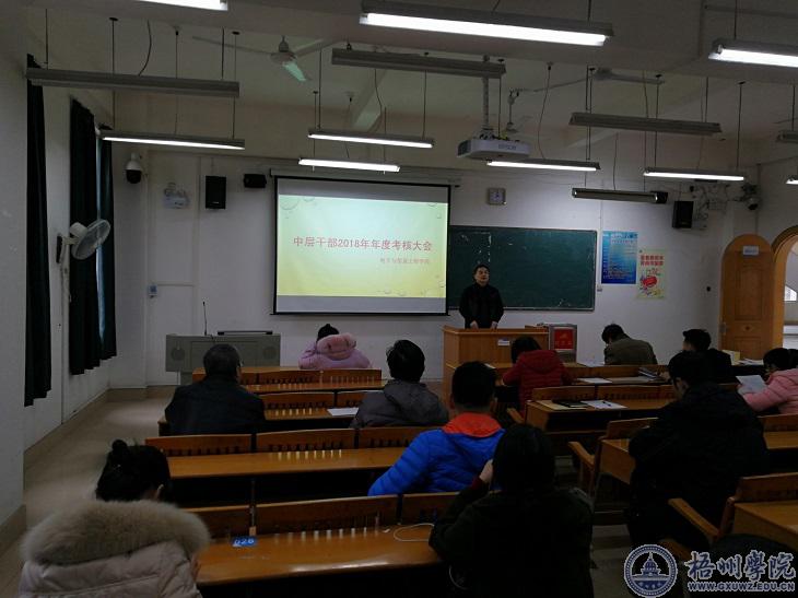 1月16日下午,根据学校党委关于《梧州学院中层干部2018年年度考核工作方案》的工作布署,电子与信息工程学院召开了中层干部2018年年度考核大会,对本部门的中层领导民主测评。会议由学院党总支书记邹木春主持。