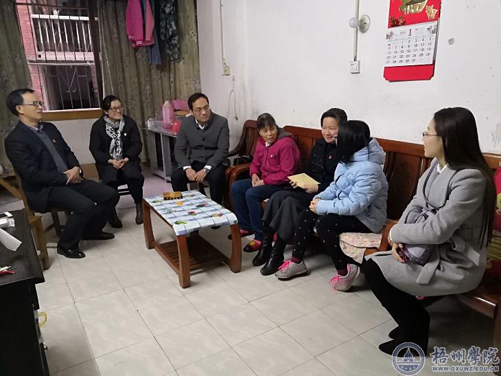 | 1月20日下午,学校党委副书记曹迎带队到贫困生梁丽家开展走访慰问活动。梁丽是我校商学院2018级电子商务专科班学生,家住万秀区城东镇河口村新一组,经济来源主要靠母亲打零工收入和亲戚的资助,家庭经济较为困难。