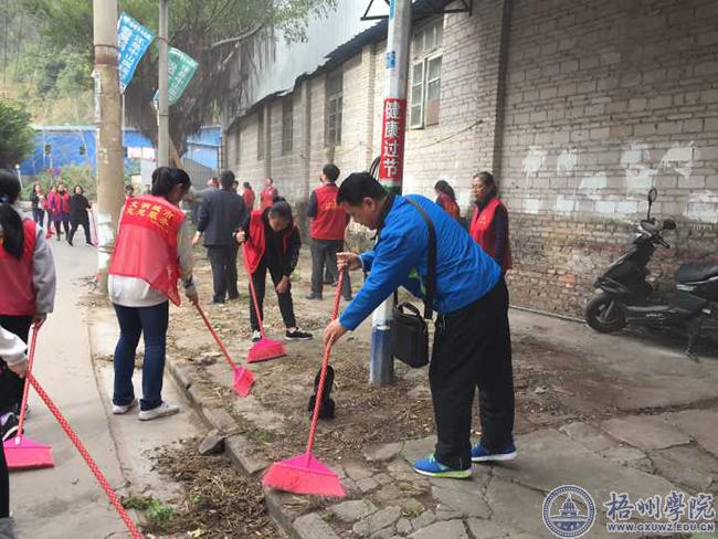 1月29日下午,为营造干净整洁、规范有序、喜庆祥和的节日环境,干干净净迎新春,热热闹闹过大年。创建“美好社区”,建设“美丽梧州”,教师教育学院组织部分教师党员进富和社区开展“喜迎新春·建设美好社区”环境卫生大扫除活动。