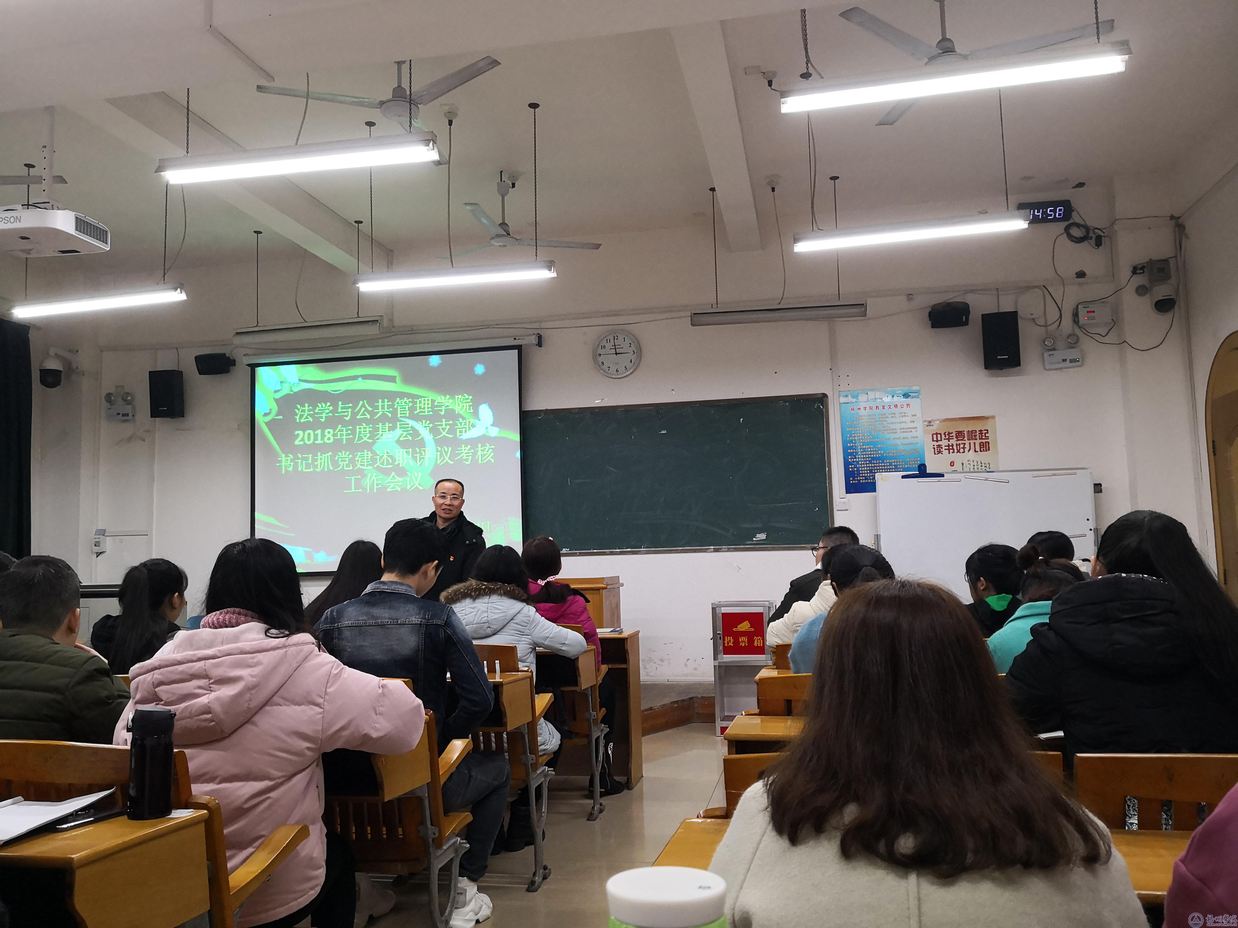 | 2月27日,法管学院在综合教学大楼M201教室召开了2018年度基层党支部书记抓基层党建述职评议考核会议。学院党总支书记黎祖立、副书记王珍,全体党员及部分师生代表参加会议。