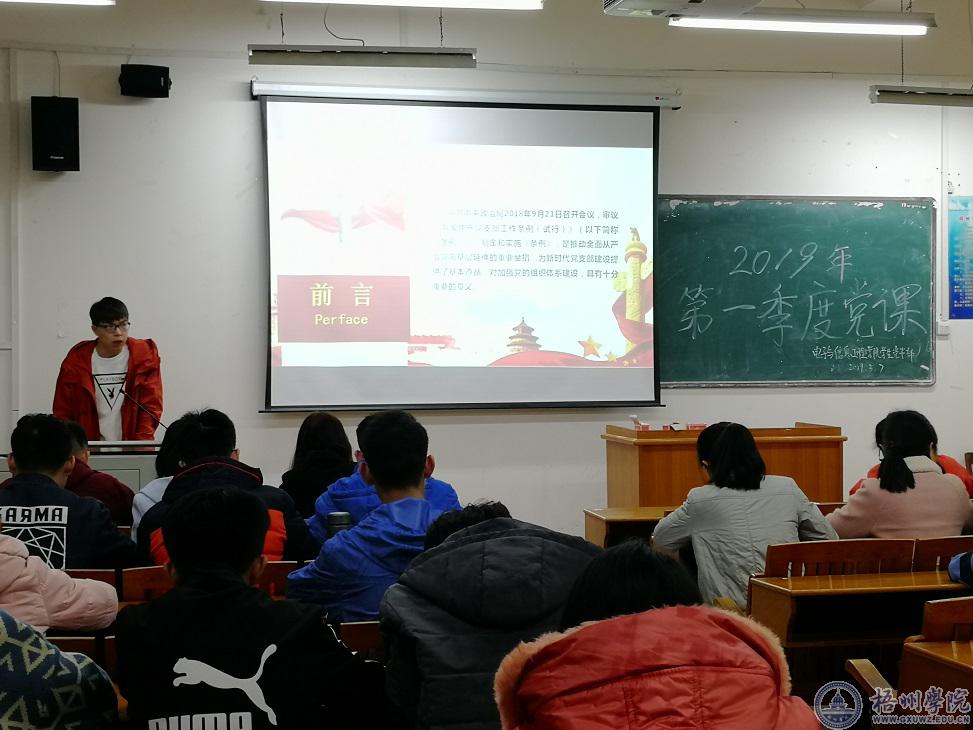 3月7日,电子与信息工程学院学生党支部组织学习会,学习《中国共产党支部工作条例(试行)》(以下简称《条例》),会议由学生党支部书记廖立波主持,电子与信息工程学院全体在校学生党员、部分入党积极分子和入党申请人参加了本次会议。