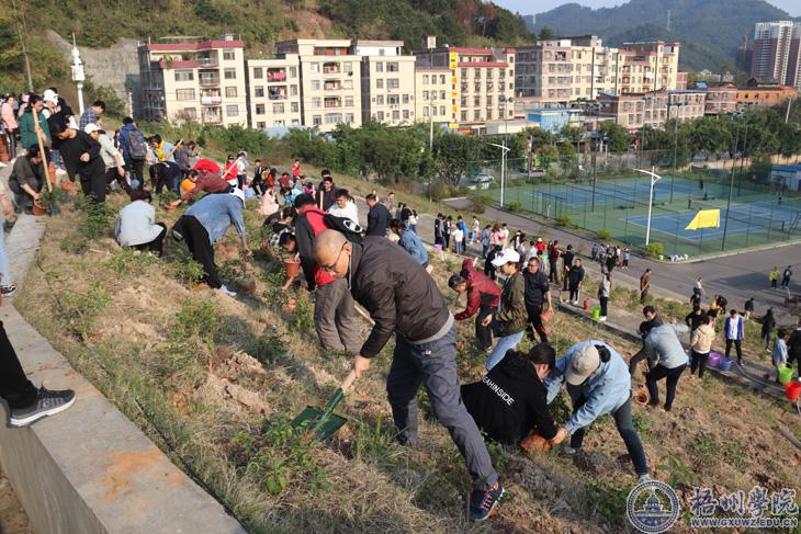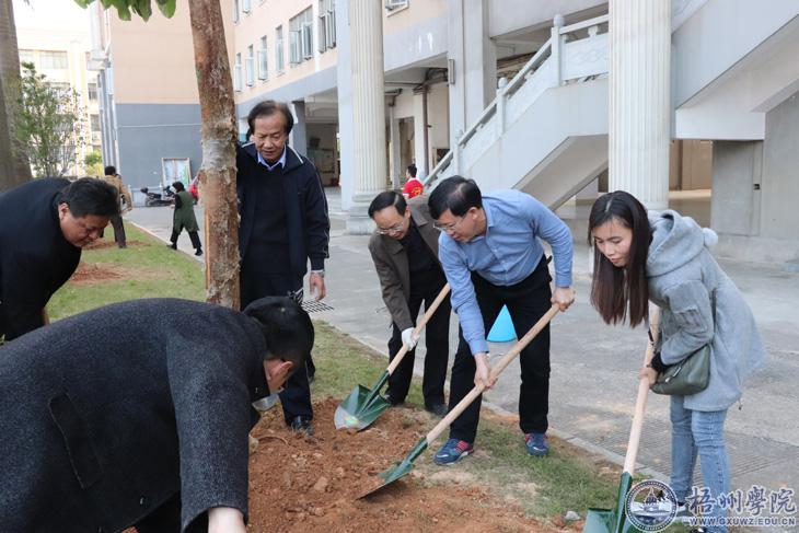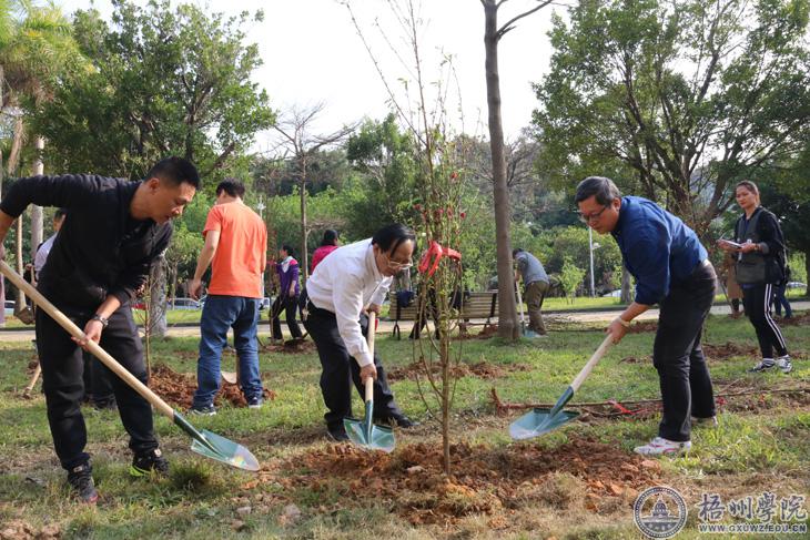 植树活动在三个区域进行,分别在我校明理楼一楼前绿化带种植六旺树16棵,其中6棵为2008届国际经济与贸易本科班校友捐赠;第一教学楼前种植桃树130多棵;在网球中心斜坡种植三角梅1000多棵。