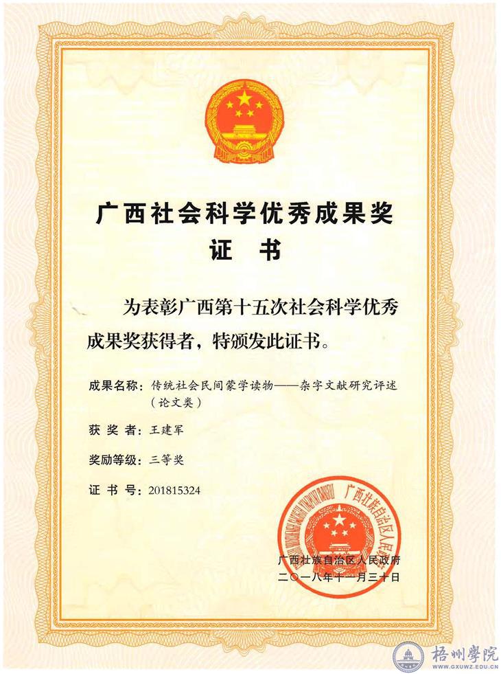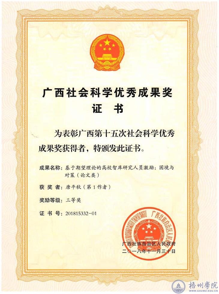 我校有3项成果获区第十五次社会科学优秀成果三等奖表彰。分别为:唐平秋、蒋晓飞的“基于期望理论的高校智库研究人员激励:困境与对策”;王建军的“传统社会民间蒙学读物——杂字文献研究评述”;陈丽平的“外国惩罚性赔偿判决承认与执行的困境与突破——以海牙《选择法院协议公约》为视角”。