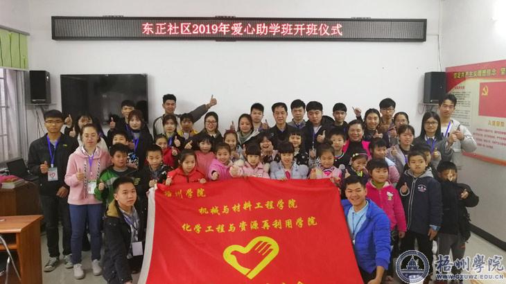 3月9、10日,机化学院青年志愿者分会到梧州市灏景玥城和东正社区举行“爱心助学班”的开班仪式,梧州市关工委委员李国楹、东正社区党委书记梁转明、梧州市肢残人协会主席杨芳红、机化学院团委副书记蒋小兰参加活动。