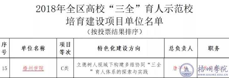1.我校获批为2018年广西高校“三全”育人示范校培育建设项目单位。我校申报的项目《立德树人视域下构建多维协调“三全”育人体系的探索与实践》获批为全区高校2018年全区高校“三全”育人示范校培育建设项目单位。 (3月19日学校官网报道)