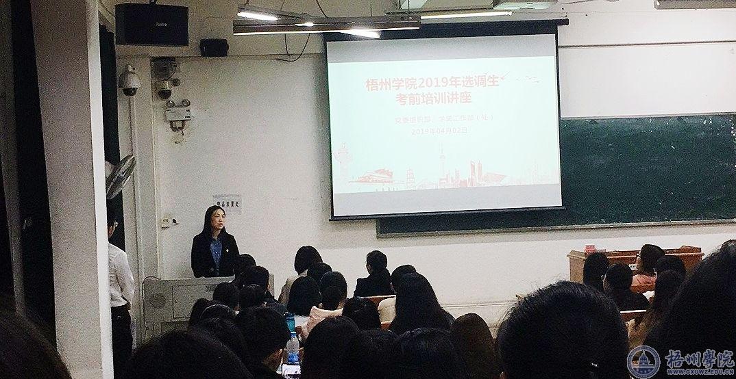 4月2日晚上19:30,学校党委组织部、学生工作部(处)在明理楼S202召开“梧州学院2019年选调生考前培训讲座”为有志于考录选调生,服务基层的100多名应届毕业生提供考前指导。