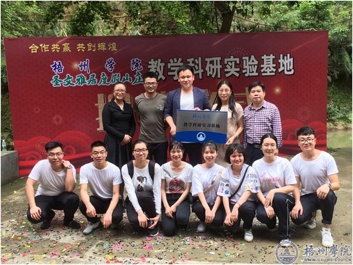 4月21日,商学院教学科研实习基地揭牌仪式在广西圣文雅居度假山庄有限公司举行。商学院副院长赵虹、旅游管理专业教研室主任唐峰陵、广西圣文雅居度假山庄有限公司总经理陀程杰、梧州圣文园总经理莫一多出席了仪式并为基地揭牌。