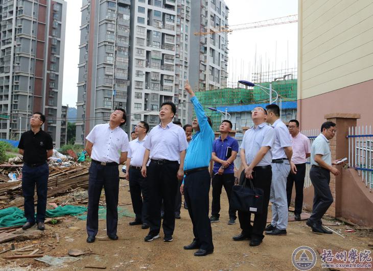 4月26日上午,梧州市委常委、常务副市长吴浩岭到我校现场办公,听取有关情况汇报,贯彻落实自治区人大领导有关指示精神,协调推进我校教职工限价商品房建设。市政协副主席韦宁,校党委书记唐平秋、副校长玉振明陪同考察项目施工 地,并参加在明理楼第一会议室召开的项目推进协调会。