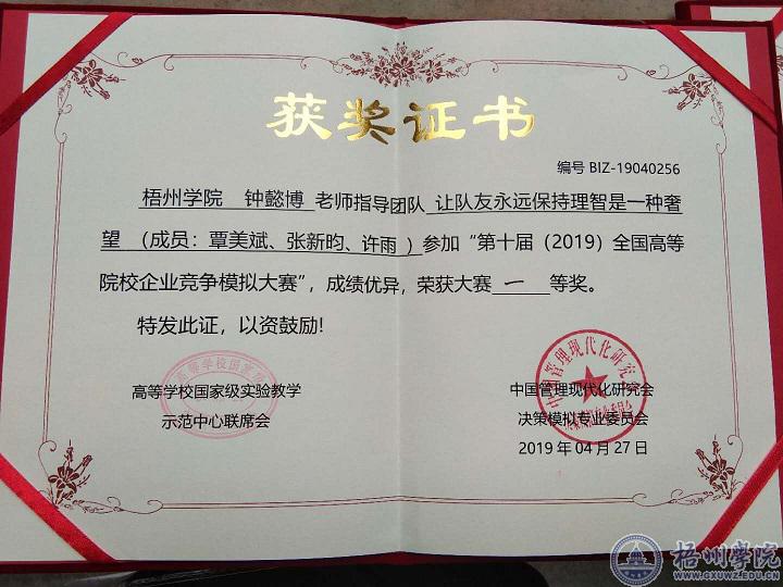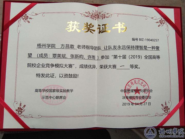 4月27日,第十届全国高等院校企业竞争模拟大赛总决赛在西南财经大学举行。我校商学院2017金融工程2班覃美斌、2017财务管理1班张新昀、18财务管理2班许雨获得一等奖。