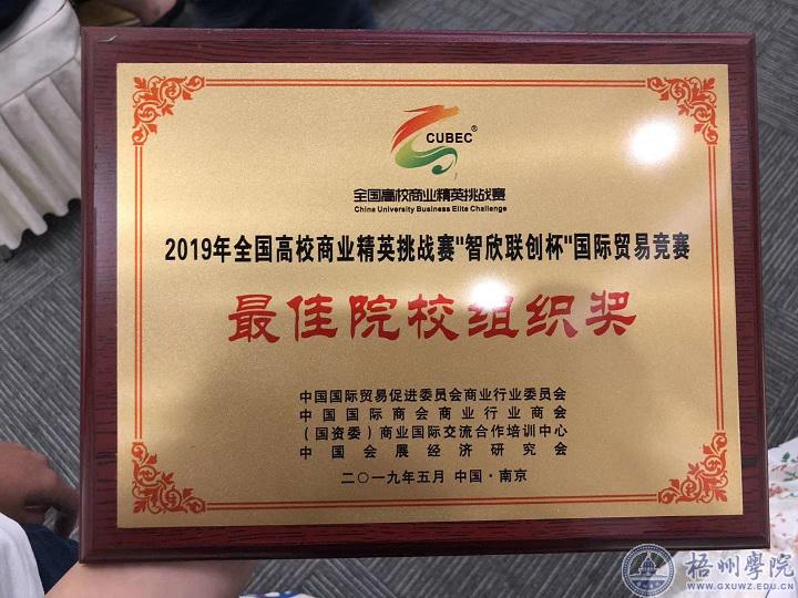 5月30日至6月3日,由中国国际贸易促进委员会商业行业委员会、中国国际商会商业行业商会、(国资委)商业国际交流合作培训中心和中国会展经济研究会共同主办的2019年全国高校商业精英挑战赛国际贸易竞赛在南京国际会展中心举行。我校商学院梁尹杰、蒋西蒙两位指导老师指导的国际经济与贸易参赛团队在本次比赛中以优异的成绩荣获全国总决赛一等奖,学校获得了最佳院校组织奖。