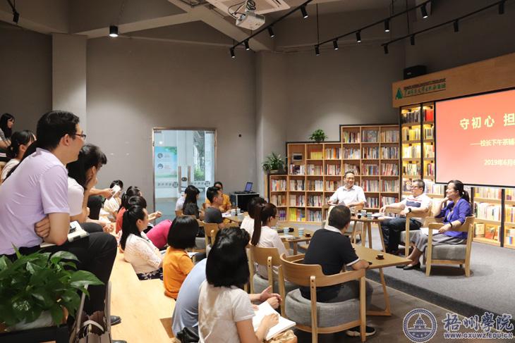 6月6日下午, 学校在明理楼独秀书房举行主题为“守初心 担使命”的“校长下午茶”辅导员专场活动。校长杨奔、校党委副书记曹迎参加活动。
