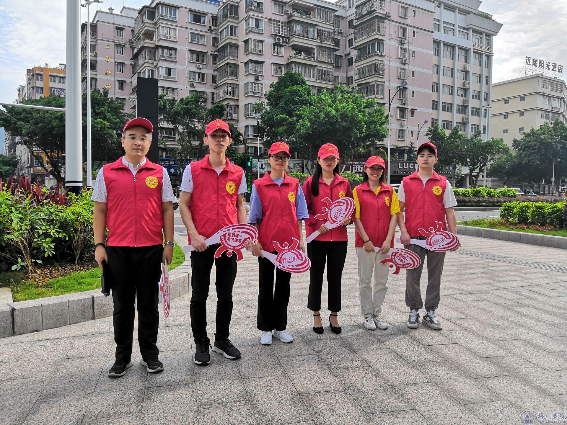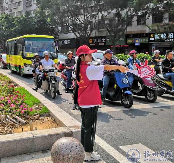 6月8日,商学院张晓磊老师带领商学院5名学生以志愿者的身份,来到万秀区西环路与新兴二路交叉红绿灯路口参加文明交通劝导志愿服务活动,以实际行动响应梧州市争创全国文明城市的号召。