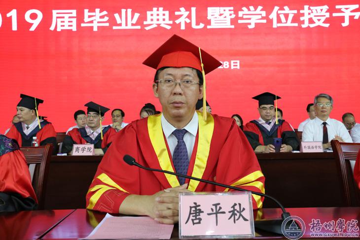 学校领导唐平秋、杨奔、曹迎、玉振明、麻新纯、甘金明,各二级学院、职能部门负责人,教师代表以及毕业生家长代表出席典礼。校党委副书记曹迎主持典礼。