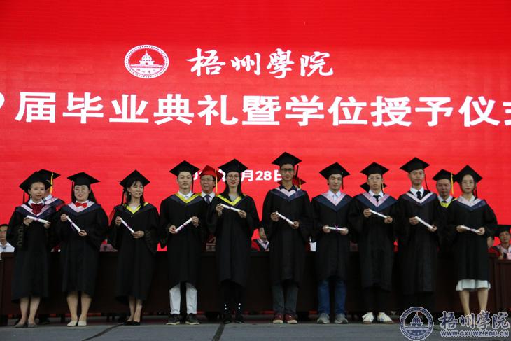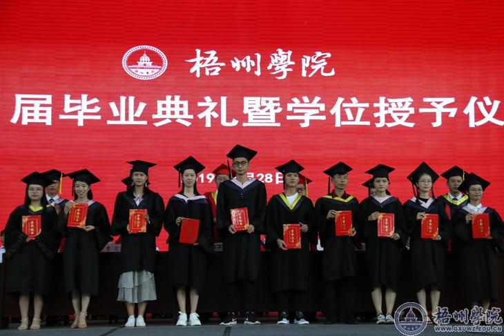 典礼上,校党委书记唐平秋宣读了“2019年度广西壮族自治区普通高等教育优秀大学毕业生”称号表彰决定,46名毕业生获得“2019年度广西壮族自治区普通高等教育优秀大学生”称号;副校长玉振明宣读“梧州学院2019届普通高等教育优秀毕业生”称号表彰决定,177名毕业生获得“梧州学院2019届普通高等教育优秀毕业生”称号;副校长甘金明宣读了梧州学院2019届学士学位的毕业生名单,2808名毕业生取得学士学位证书。学校领导为毕业生代表一一颁发了荣誉证书、学历学位证书,为33名考取硕士研究生的毕业生发放了奖学金。