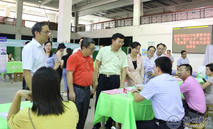 6月27日上午,学校与广西毕业生就业促进会在我桃体育馆联合举办2019年夏季毕业生暨“建档立卡”毕业生“青聘果”智能双向选择洽谈会,为我校今年即将毕业的3200多名大学生提供就业、择业的机会。学校党委书记唐平秋、校长杨奔、党委副书记曹迎到招聘会现场指导大学生就业创业工作。
