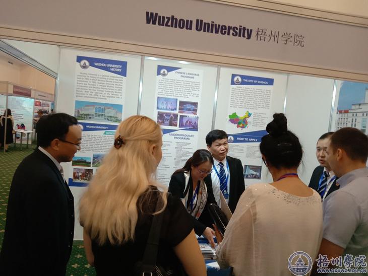 参展期间,中国驻阿拉木图科教领事米桂雄、阿拉木图市教育局主任塔季亚娜、自治区教育厅国际交流处处长罗耀光等先后到我校展位参观,听取我校有关情况介绍,对我校在广西高校中较早与哈萨克斯坦国立师范大学互派交换生表示肯定。我校参展人员现场发放了留学生招生宣传册,与哈萨克斯坦亚洲教育中心负责人,详谈了修改原有协议部分内容,继续推荐留学生事宜,与哈萨克斯坦经济大学、国际商务大学商谈了交换生事宜。近100名哈萨克斯坦大学负责人、留学中介工作人员、学生到我校展位咨询留学事宜。