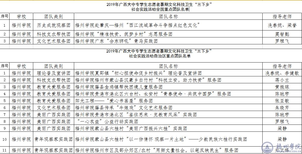 近日,自治区党委宣传部、自治区精神文明办、自治区教育厅、团区委、自治区学联联合发布《关于公布2019年广西大中专学生志愿者暑期文化科技卫生“三下乡”社会实践活动重点团队名单的通知》,公布了今年暑假社会实践活动重点团队名单。我校共有14个团队入选2019年广西大中专学生志愿者暑期文化科技卫生“三下乡”社会实践活动全国、自治区重点团队名单,其中,梧州学院广东“合东狮吼”青马实践团等3个团队入选全国重点团队;梧州学院夏郢镇“初心担使命促乡村振兴”理论普及宣讲团等11个团队入选自治区重点团队。