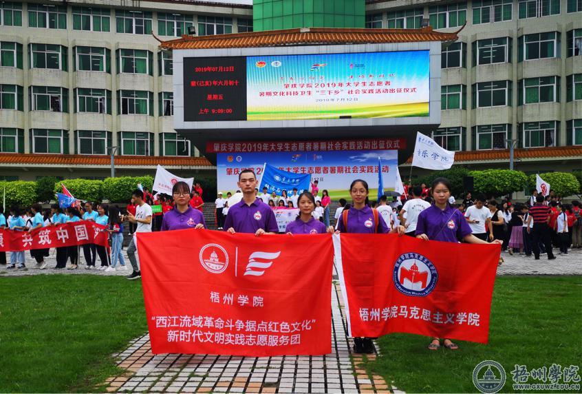 7月12日上午,梧州学院赴肇庆—梧州“西江流域革命斗争据点红色文化”新时代文明实践志愿服务团的5名马克思主义学院同学以东融友好使者的身份参加了肇庆学院2019年“三下乡”社会实践活动出征仪式。
