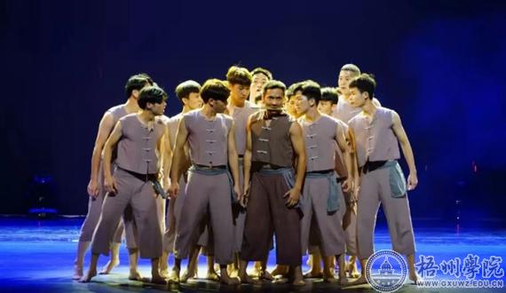 男子群舞《顶·硬·上》,由我校和梧州市文艺培训中心联合创作,为本次庆祝新中国成立70周年暨第七届全区基层群众文艺会演舞蹈类参赛剧目,作品以梧州民间劳动号子“顶硬上”为创作灵感。通过对梧州码头挑夫汉子形象的塑造,表现出梧州码头挑夫面对命运誓不低头的精神以及对美好生活的憧憬与向往,表达了“幸福是奋斗出来的”人生理念。