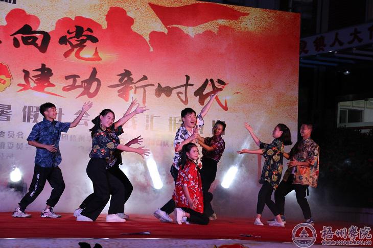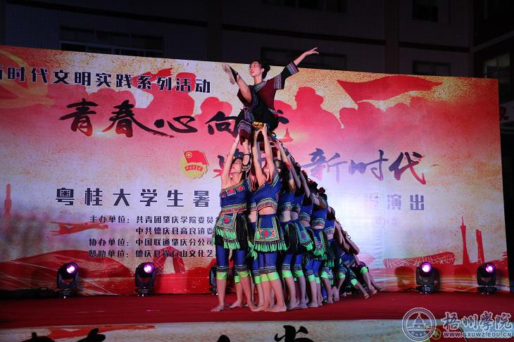 7月19日晚,我校大学生艺术团成员和肇庆学院音乐学院的学生以“青春心向党 建功新时代”为主题,在肇庆市德庆县高良镇政府大院为当地群众奉上了精彩的文艺演出。我校大学生艺术团舞蹈队表演了《女附马》《走呦走呦》《侗家待客喜盈盈》等节目。