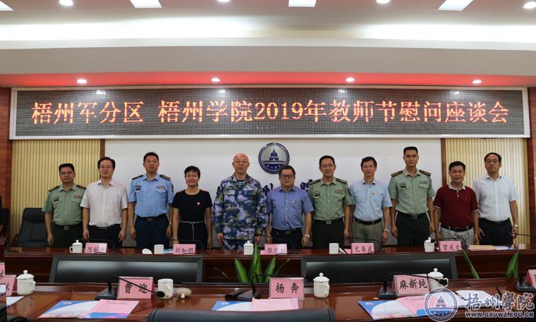 9月5日上午,在明理楼八楼第一会议室,梧州军分区司令员张汉川率队到我校开展教师节慰问活动,校领导杨奔、曹迎、麻新纯参加座谈。