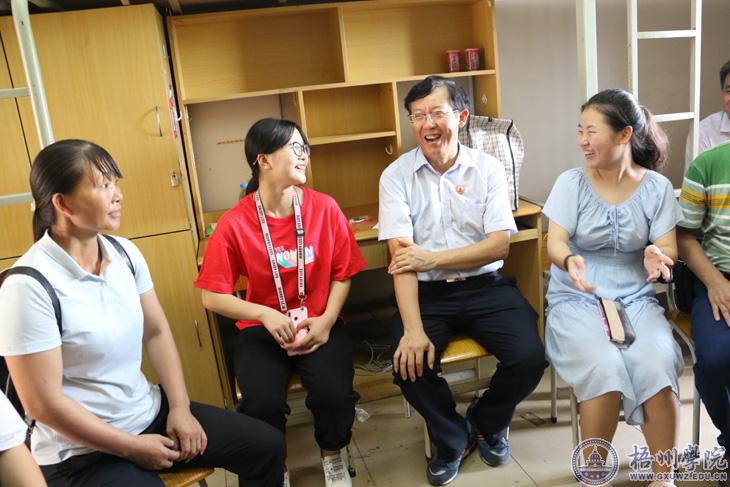 在A11-B912宿舍,校党委书记唐平秋与2019级哲学班新生们及其家长交流。他希望新生能尽快适应大学生活,学会自我规划和自我管理。他建议新生在学有遗力的情况下,适当参加社团组织的活动,充实大学生活,提高自身各方面的能力等。唐书记了解到该宿舍的新生多是怀着对哲学的热爱而选择这个专业,他鼓励她们往哲学专业考研方向发展,通过考研到达更高的学习平台。唐平秋对家庭经济困难新生阮玉艳说道,学校设有勤工俭学岗位、各类奖助学金到位,有助于家庭困难的学生完成学业。