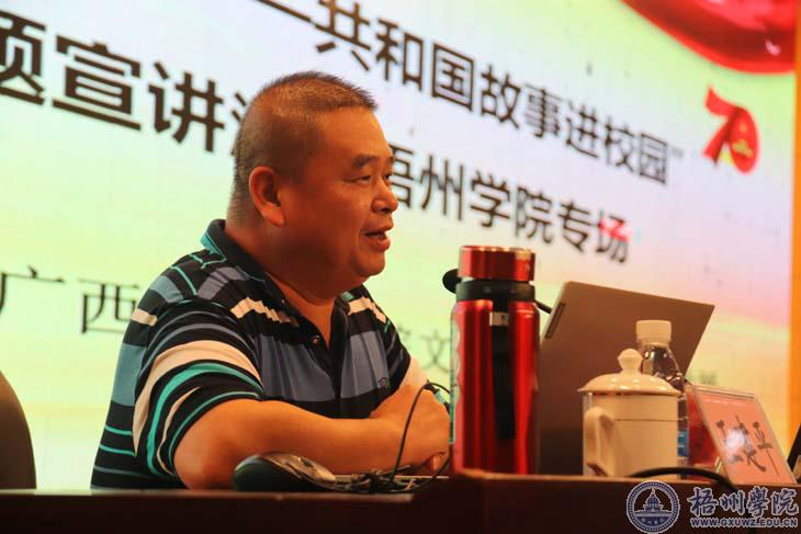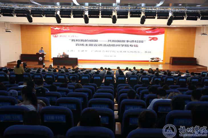 9月19日下午,我校“我和我的祖国——共和国故事进校园”主题宣讲活动在明理楼学术报告厅举行。广西社会科学院文化研究所所长王建平教授应邀作题为《让我们的青春和祖国一起飞翔》宣讲。各二级学院学生代表560多人参加活动,宣讲会由学校团委书记李德华主持。