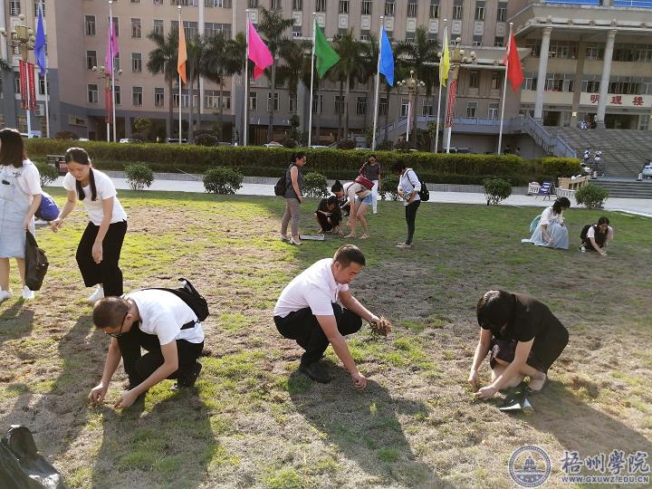 商学院全体师生党员在开展“不忘初心、牢记使命”主题教育学习中,把“学”和“做”结合起来,主动担当作为,以实际行动,从身边事做起。9月25日下午,在主题教育读书班学习结束后。商学院师生党员顶着烈日,到教学楼前南广场参加草坪养护工作。师生党员带着垃圾袋、纸箱等工具,对南广场草坪的杂草进行了拉网式的清除。