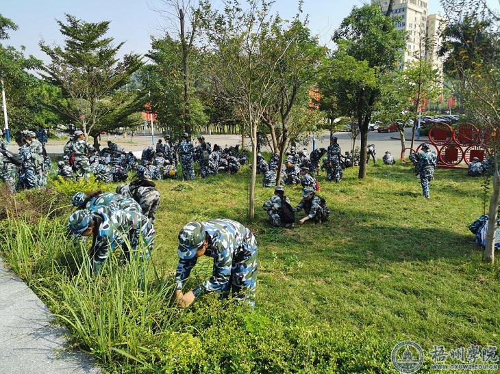 近日,我校武装部组织军训学生开展“迎国庆校园清洁活动”,2019级军训新生800多人利用军训休息期间积极参与了清洁活动,活动内容主要是清除校园内杂草。