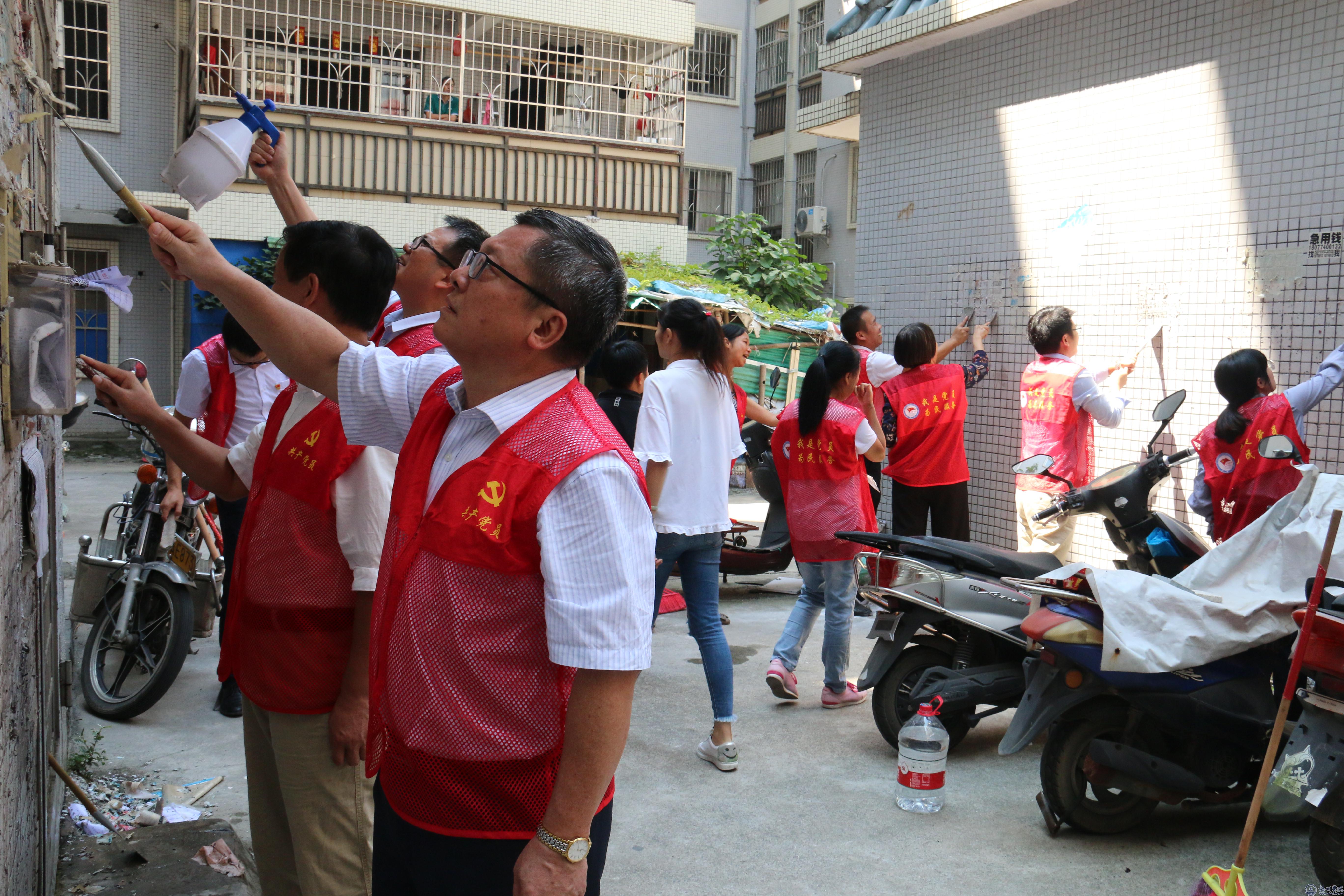 杨奔校长带领师生党员们在小区内16幢周围对墙面广告纸、乱张贴海报等进行全面清理,用实际行动推动社区环境改善,以干净、整洁的崭新面貌喜迎新中国成立70周年。