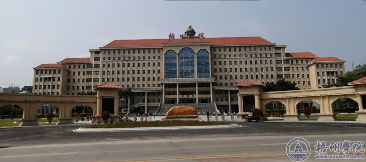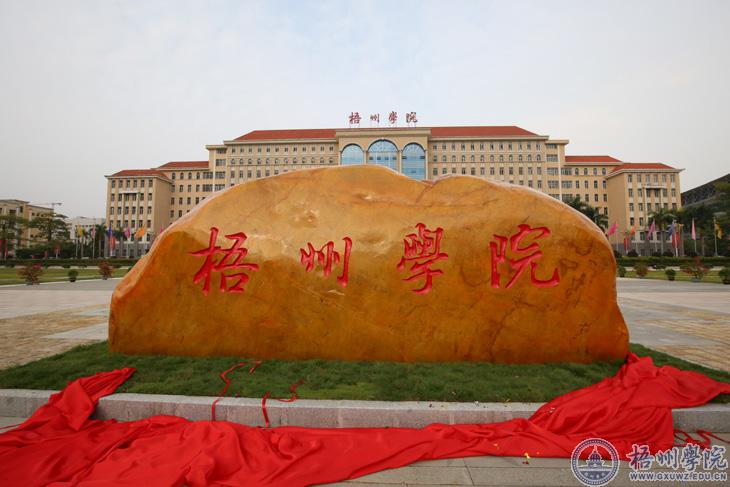 校名石正面镌刻梧州学院校名,背面刻有校训“明德、博学、求是、创新”,是大学精神和校园文化的重要载体。校名石长6.7米,地面高度2.68米,厚1.1米,重约47吨,寓意梧州学院份量十足,根基深厚。校名石选用材质坚硬、颜色醒目的英德黄,从正面看宛如一只在桂江边汲水的大象,从背面看宛如一头蓄势待发的雄狮,整个造型浑然天成,简洁大方,端庄厚重,与雄伟的明理楼和开阔的珠山广场有机地融为一体。它承载着学校深厚的文化底蕴,饱含着梧院人砥砺奋进的汗水与付出,蕴含着莘莘学子的聪明才智,更凝聚着广大校友和社会各界对我校的殷切期望。
