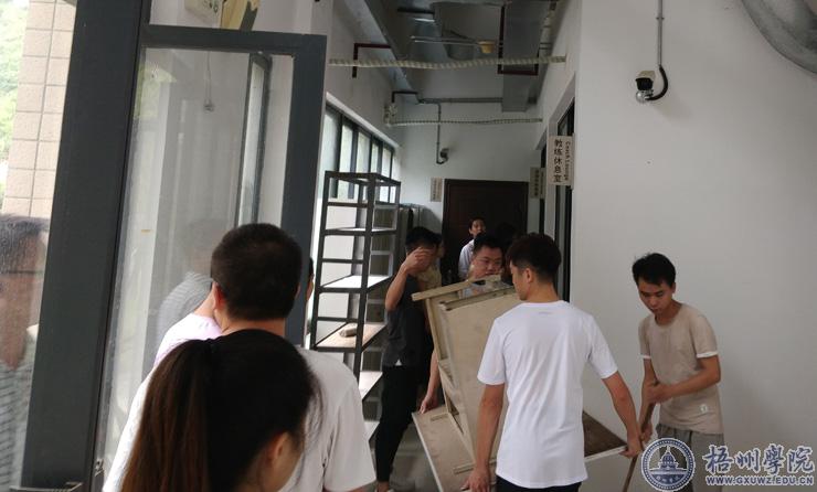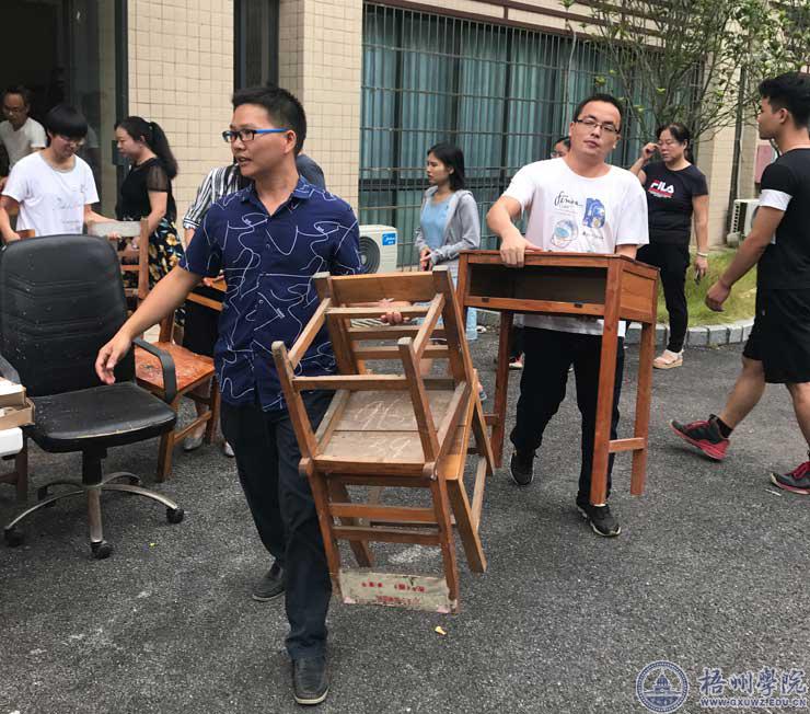 活动中,师生党员们按照工作安排,整理过道旧桌椅和相关文件盒,以及室内外门窗进行清洁。此外,为个别新建实验室整理出一些空间。