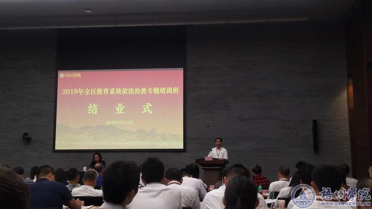 10月12日上午,由自治区教育厅举办的2019年全区教育系统依法治教专题培训班结业仪式在百色干部学院举行,自治区教育厅政策法规处处长唐春燕,参加培训班的全区高校依法治校工作部门负责人,各市、县(区)教育局领导和相关人员160多人出席。