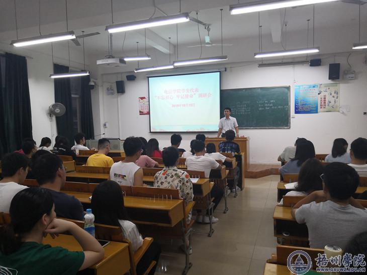 10月15日下午,电信学院在M403教室召开“不忘初心、牢记使命”主题教育学生管理工作调研会,辅导员代表、学院团委学生会、各班级学生代表参加会议。会议由学院党总支副书记陈兴主持。