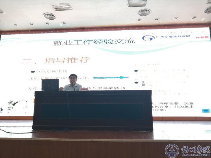 为做好我校2020届毕业生就业数据的上报和就业数据统计、核查,帮助我校学生树立正确的择业观和就业观,提高毕业班学生的就业、创业技能与实践能力,学工处邀请广西大学生就业服务中心副主任于胜伟老师,于10月18日上午在学校明理楼学术报告厅给我校全体辅导员和毕业班学生代表进行了一次就业指导专题讲座,出席本次讲座的有学校全体辅导员、2020届毕业班各班代表以及各年级学生约700人。讲座由学生工作处副处长唐仁洁主持。